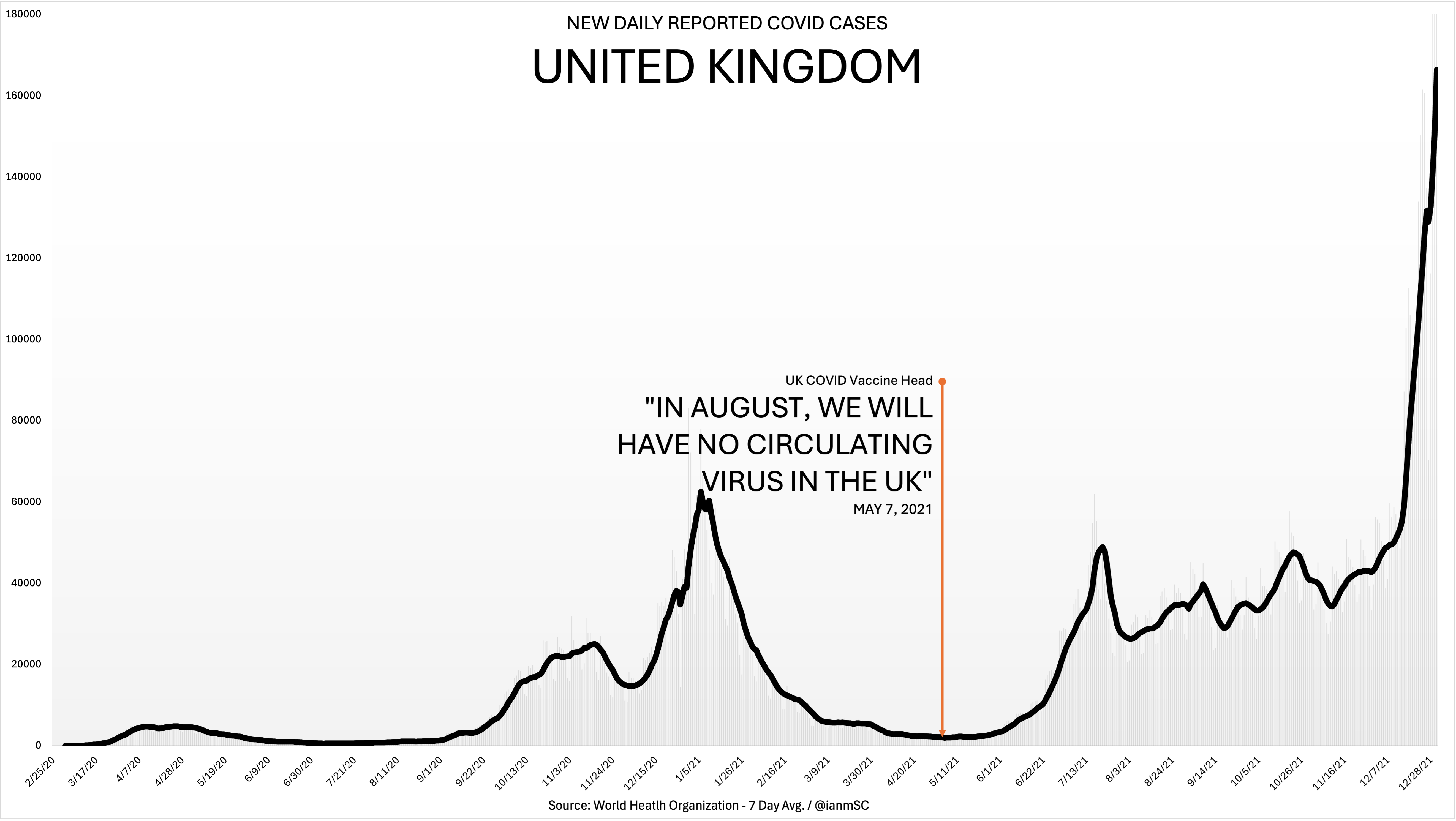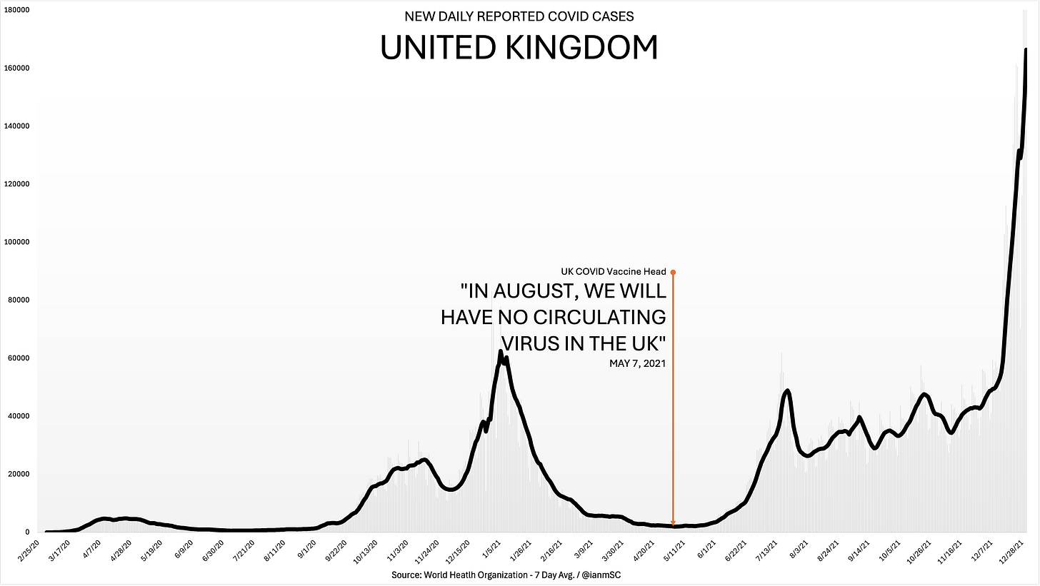 This is the person who said that the vaccines would quite literally eliminate the virus entirely from Britain. In a matter of a few months. By the end of 2021, the UK was routinely reporting around 200,000 cases per day, the highest number at any point in the pandemic.